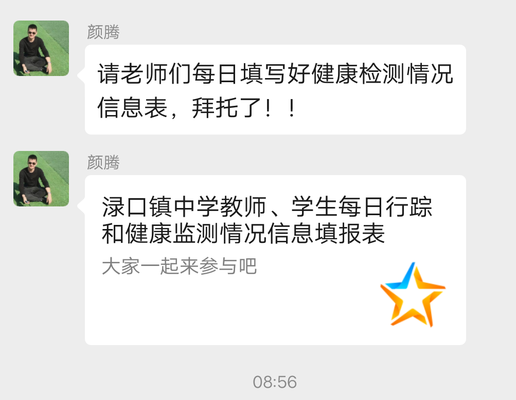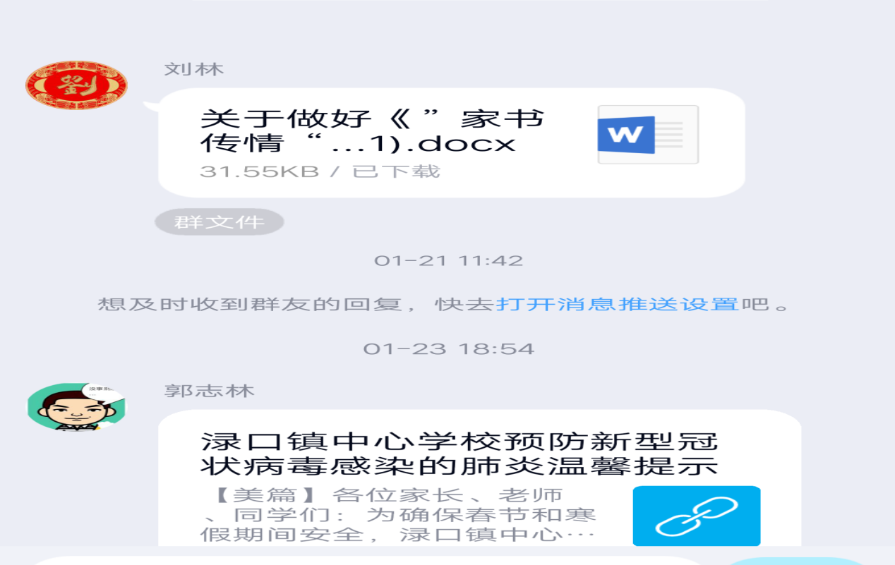 1月23日,渌口镇中学党支部书记、校长郭志林在教师QQ群转发渌口镇中心学校制作的"预防新型冠状病毒感染"的美篇,提醒各位家长、老师、学生及时关注冠状病毒传播情况,做好个人卫生防护。