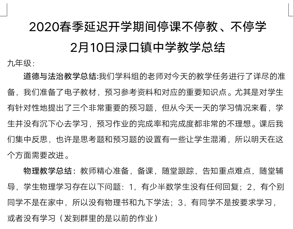 为积极应对新型冠状病毒感染的肺炎疫情,根据区教育局通知精神。保障学生"停课不停教、不停学",积极开展线上教育教学,全力保障教学质量。2月7日,主管教学的唐立钢副校长在学校教师群发布《株洲市渌口区渌口镇中学2020年春季学期延迟开学期间教育教学工作计划》。要求全校教师充分利用信息化教育教学手段,通过微信群、qq群、校园网网络平台积极开展线上教育。以学科组为单位,将本年级该科每天学生学习、作业完成情况写一段简短文字层层上报,线上教育教学从2月10日开展到现在,效果良好。