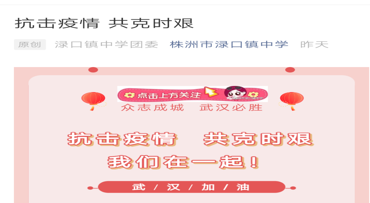 2月19日,历时3天制作、学校师生32人(其中党员13人)参与,推出一期专题渌口镇中学公众号《抗击疫情,共克时艰》,党员们用诗歌、书法、美术作品、歌曲以及深情的祝愿视频,为武汉加油!为中国加油!发布不到一天,阅读量就近2500人,稿件还被"掌上渌口"采纳。
