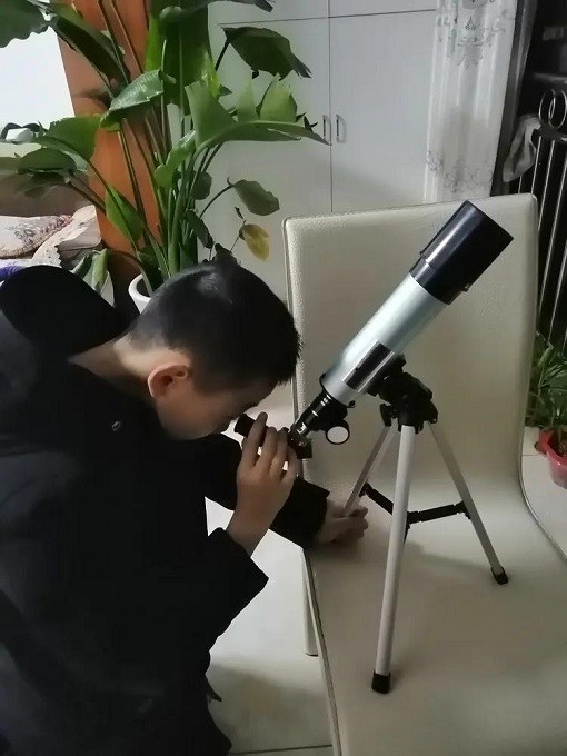 我运用家庭、身边能找到的材料制作创意手工作品、科学趣味实验。一张简单的各种颜色的纸,通过画、剪、贴、涂动手实践变成了 “美丽的千纸鹤、蛇龙、蜥蜴、陀螺、喷泉”。观察探究小鱼在池中小嘴一张一闭的内在秘密;通过望远镜观察到的月亮,月亮的表面上有许多陨石坑的原因。不懂的地方查查百度,问父母,亲身感受到科学的奥秘。