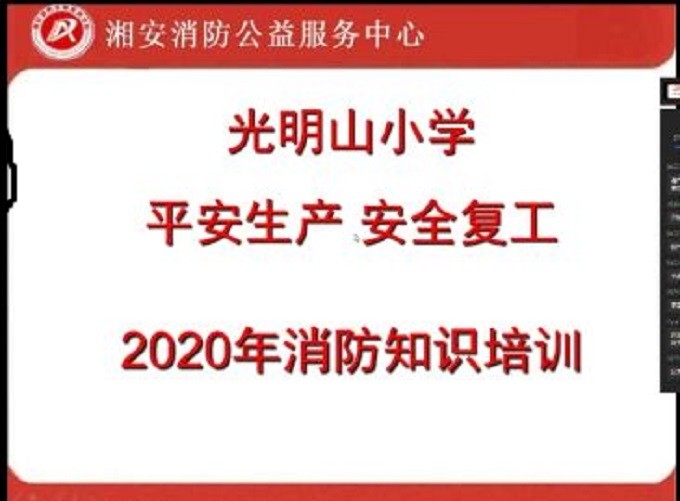 为进一步提高全体教职工消防安全意识和自防自救能力,认真贯彻《中华人民共和国消防法》,切实做好消防宣传工作。在当前全国上下众志成城,坚决打赢疫情防控阻击战的关键时期,做到不集中,不扎堆。芦淞区光明山小学于2020年3月4日下午2点30分,特邀湘安消防公益服务中心的教官,为全体教职工开展了线上消防知识培训。