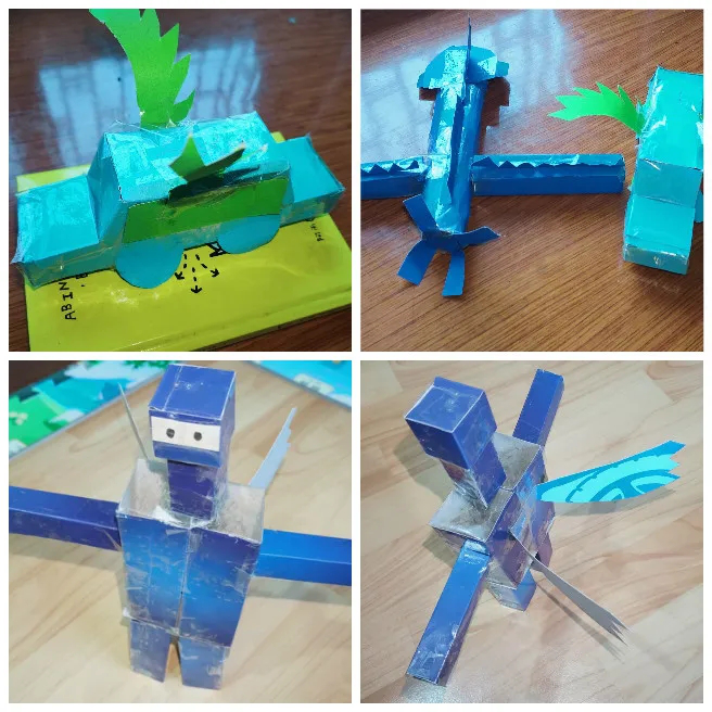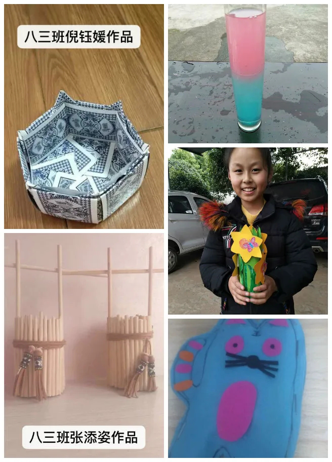 宅家时光里,手工创作自然不会缺席。孩子们用扑克牌做收纳盒,用筷子、热熔胶粘小笔筒,用卡纸制做小花、小猫,还自制出能够分层双色水。五年级小朋友制作了“鸟车”和“鸟人”等系列作品,她们说:“有了翅膀的‘加持’,抗疫救援物资的运送就能更加及时了。”