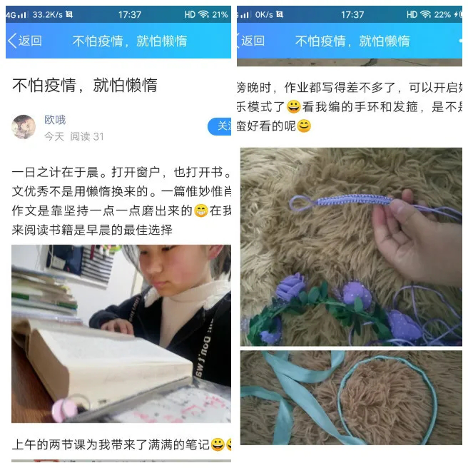 在老师的线上指导下,孩子们练起毛笔字,反反复复写的就是她内心最想表达的心声,长辈们也忍不住围过来观摩,不时给予点评和鼓励。还有的同学在班主任的带领下学习用美篇记录生活,记录着这个有些特殊的假期。