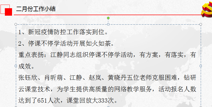 在查看了党员交纳党费的情况后,邓书记进行了2月的党建工作总结及3月份的党建工作部署。邓书记指出,2月份全体党员积极响应政府“停课不停学”的号召,认真组织了各项网上教学工作,希望各位在此基础上更上一层楼,继续加强新冠疫情防控工作,继续高质量的开展停课不停学活动,做好复学前各项准备。