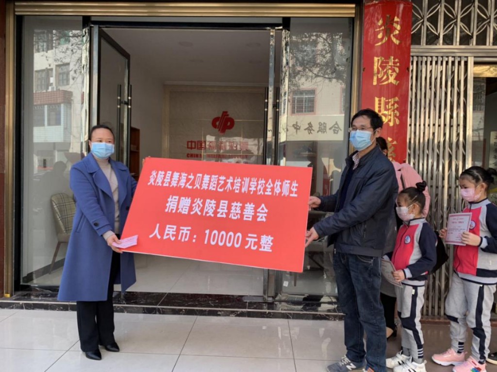 2020年2月24日,株洲市炎陵县民办舞海之贝艺术培训学校教师和学生代表,将10000元爱心款捐献给了炎陵县慈善会,用于“新型冠状病毒肺炎疫情”防控。自发生新型冠状病毒肺炎疫情以来,炎陵舞海之贝舞蹈艺术培训学校,组织教师认真录制抗疫宣传视频,供同学们学习,宣传如何防治新型冠状病毒,普及相关防控知识。另一方面,倡议学生进行家庭训练,强身健体的同时赢取公益基金。(学生学习打卡一天,学校提供5元公益基金)。自倡议发出之后,同学们热烈响应,共有138名学员参与此活动,筹集公益基金6420元。另,学校董事会及老师捐款有3580元。学校共捐出爱心款10000元整。