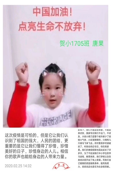 疫情肆虐,假日漫漫。贺小学子人小能量大,都积极参与到防控感染、抗击疫情中来,用自己的实际行动向病毒说“不”。他们用手语舞蹈的形式边唱边舞,宣传抗疫知识,释放正能量,给奋战在一线的英雄们加油鼓劲。