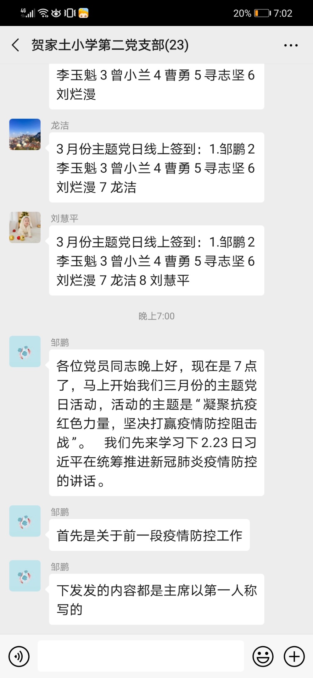 3月6日下午6点50分,贺家土小学第二支部微信群开始热闹起来。原来今天是贺小第二党支部召开三月主题党日活动的日子。因为疫情原因,这次活动还是在线上开展,第二党支部的成员按时上线签到,积极参加本次主题党日互动。