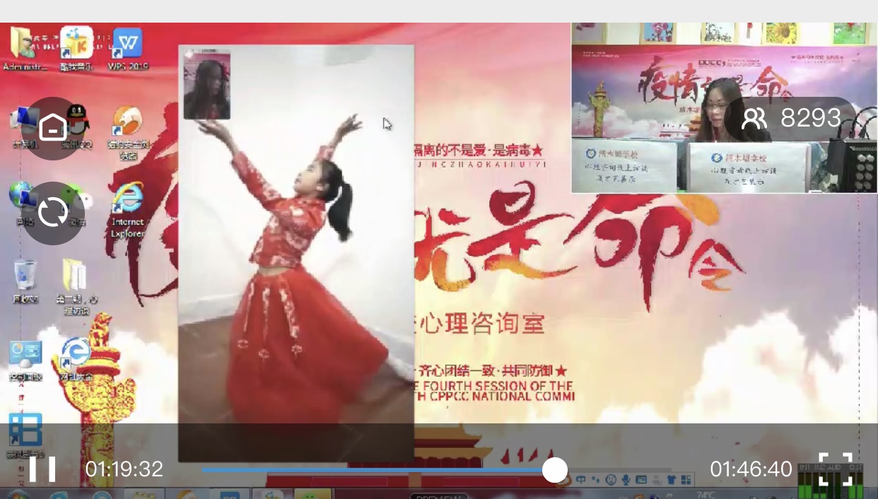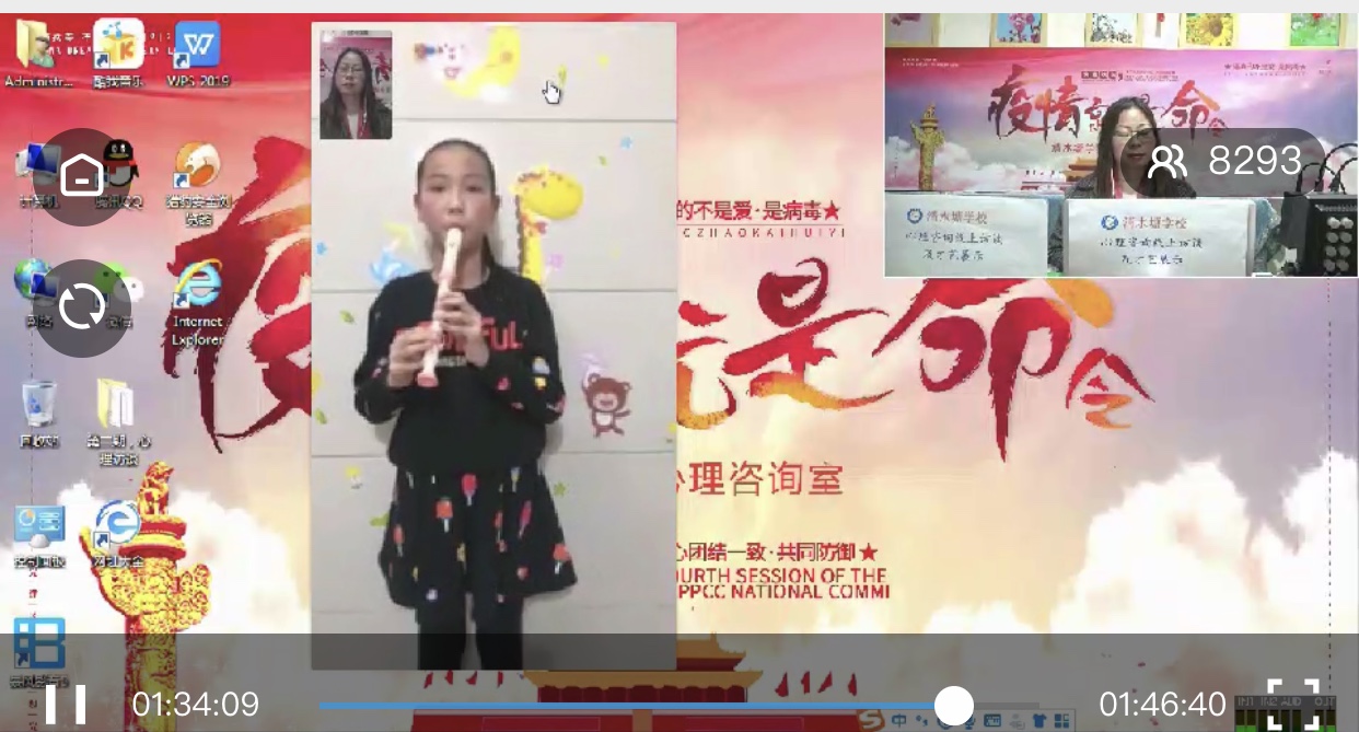 在才艺展示直播环节,同学们以朗诵、舞蹈、器乐、手舞、唱歌等表演形式,把居室变成了舞台,把自己变成了小演员,把网络变成了视听设备,积极投入到表演之中。如126班毛睿琳同学朗诵《口罩“小被窝”》、114班翁雪琴同学钢琴弹奏《(一)练习曲(选自儿童园地)》、113班龙言思静同学古筝弹奏《荷塘月色》、113班张雨荨同学竖笛演奏《隐形的翅膀》、129班张芷言快板《防疫歌》、130班邹语涵同学表演拉丁舞、119班龙子妍同学表演手舞《听我说谢谢》、106班刘子璇舞蹈《旁提立圆》、136班余曼妮同学表演拍手歌《防控疫情靠大家》、117班颜昕雨同学歌唱《青柠》……精心地准备、精彩地表演让同学陶醉在艺术的殿堂,分享快乐的自我。