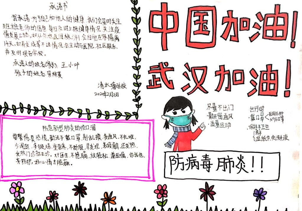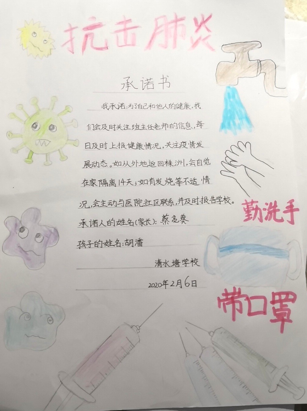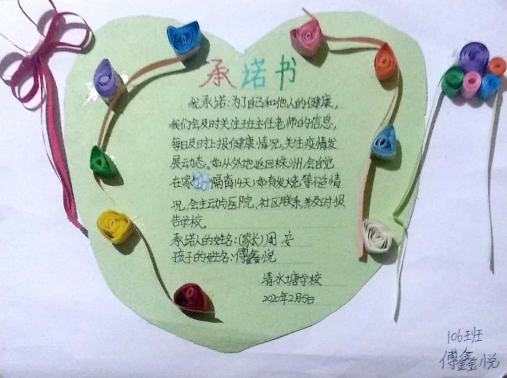 106班罗梓菱、113班龙言思静、113班湖潘、113班王卓钥、106班傅鑫悦、128班程俊婷、110班赵可欣、121班龙子晨、121班李艺榕、114班彭雨晨等同学自主绘制晒晒疫情防控承诺书。