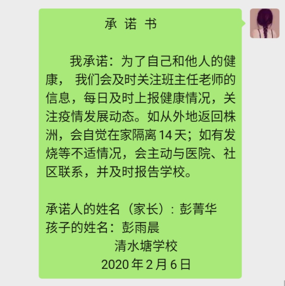 全体班主任刘丽是副校长从线上承诺、亲子宣读、宣传晒晒等方面,引导家长积极完成“疫情防控承诺书”,阅读承诺的内容与行动,共同抗击疫情。
