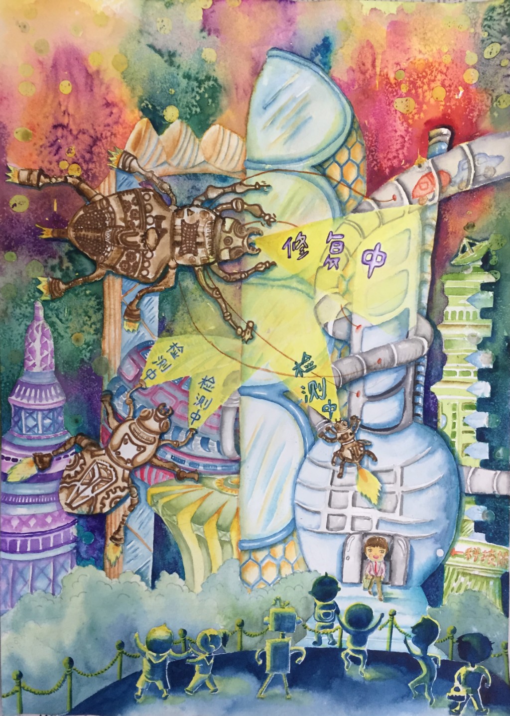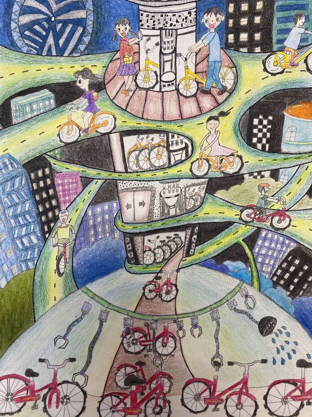 周艺老师和宾璨老师指导的《智能单车坪》等科幻画作品贴近生活、想象丰富、构思巧妙。学生能用童真的视角、独特的创意、精湛的画功表达自己对生活的关注,解决生活中遇到的难题。
