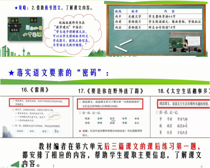 首先,由袁江老师针对《雷雨》课例讲述语文要素的落实策略,强调"两个借助,两个抓手",借助关键词和板书图文,以字、词语和句子的模块教学和课后习题为抓手,精准把握统编教材,有效落实语文要素。