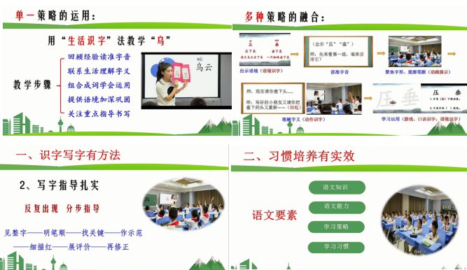 随后,李蓉晖老师以教学中的识字写字与习惯培养为切入点,分析课例中使用的识字方法向教师们讲述识字教学有其灵活性。识字方法多种多样,如:语境识字、生活识字、游戏识字、对比识字、字源识字等等,执教者应借助这些识字方式把枯燥乏味的识字过程变为快乐识字。李蓉晖老师还分享了习惯的培养,肯定了批注使用的规范性。