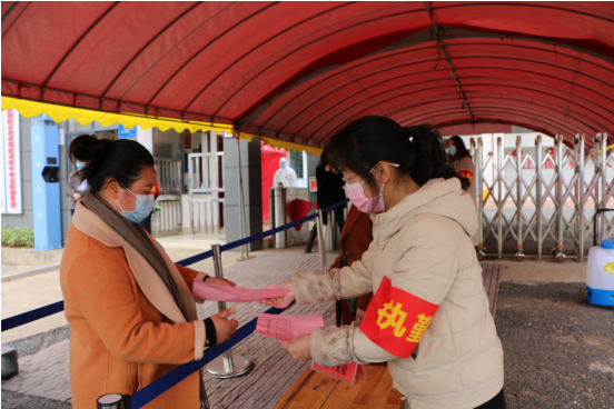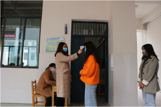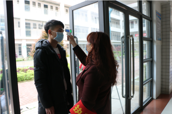 “请师生保持间隔1.5米,排队进入体温检测消杀通道……”在经过学校保安和值班教师的体温测量和登记后,学生将体温登记卡交给值班教师。在值班教师一一核实学生的《健康状况日监测表》和返校承诺签名后,学生依次完成足底、行李和手部消杀后,有序进入学校。