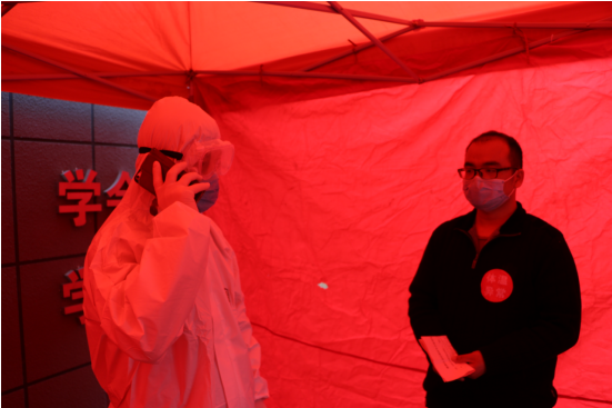 “嘀嘀嘀……”此时,一名体温异常的学生经过筛查门。“体温过高,请你等一下”,执勤安保人员迅速将该体温异常学生带入隔离室,校医再次对该学生进行体温测量并询问和记录该学生近期的身体情况、外出史、接触史,然后联系家长将学生送去定点医院发热门诊。