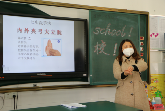 “今天你感觉怎样?”班主任老师对前来教室报到的学生再次例行询问并对其进行体温测量、登记,确认正常后才可进入教室。随后,班主任进班为同学们带来开学防疫教育第一课。课堂上,班主任现场演示“七步洗手法”和口罩的正确佩戴法。