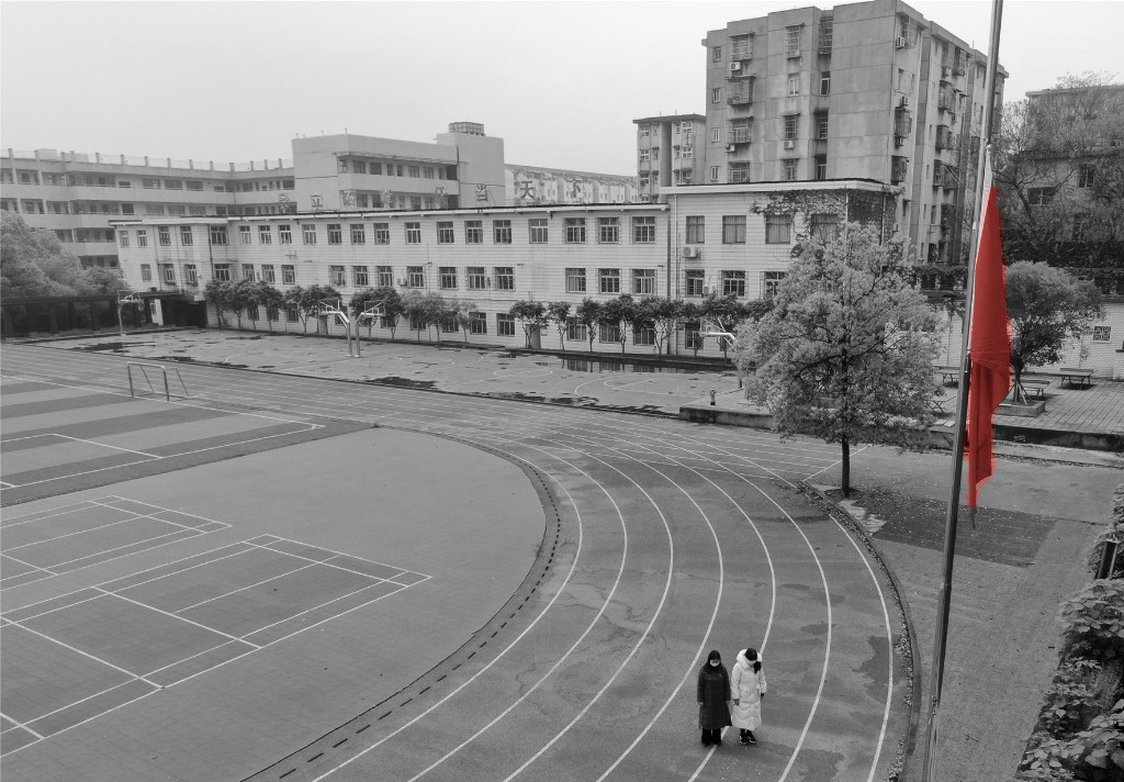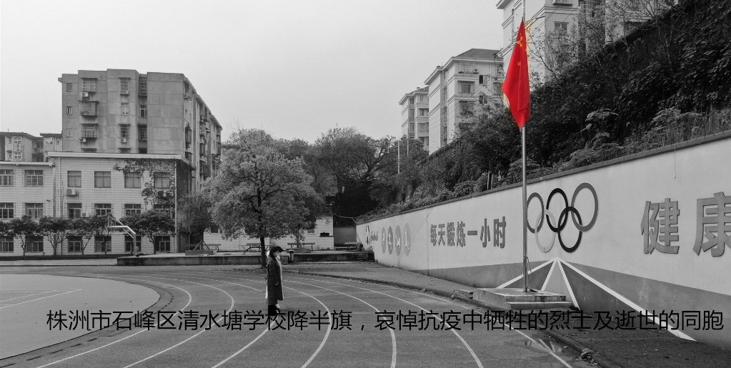 2020年4月4日上午10点,清水塘学校校园上空,防空警报响起,清水塘学校副校长刘丽明、学生工作部主任王萦裳等在清水校园降半旗哀悼抗疫牺牲烈士和逝世同胞。