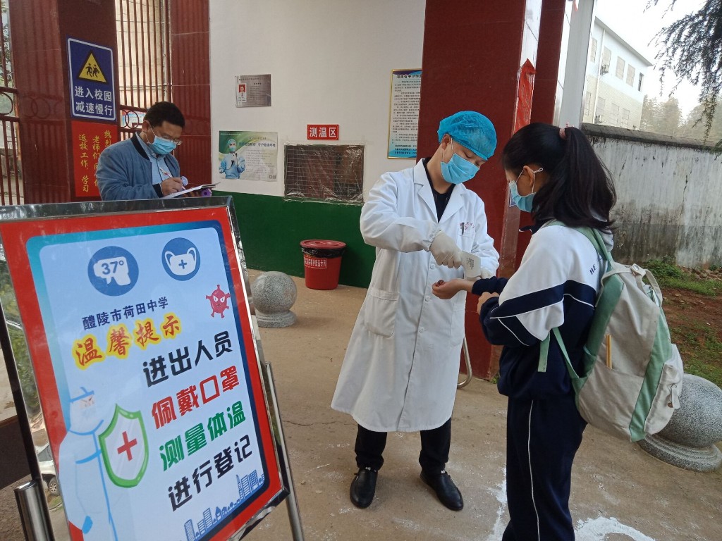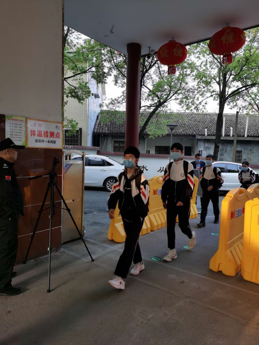 早上7点,太阳已经露出了微微的笑脸,醴陵一中大门口,交警在有序指挥交通,公安和城管队员在维持秩序,市卫健局、疾控中心的医生们在依次对学生们进行体温检测,高三的学生以一米的间距,排着整齐的队伍,依次测温入校。