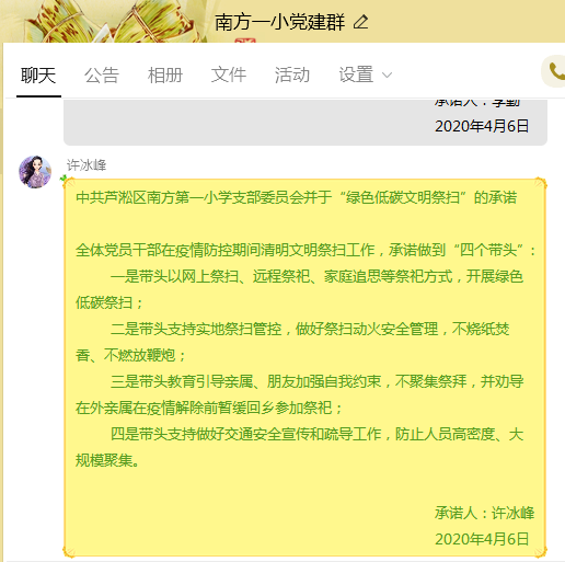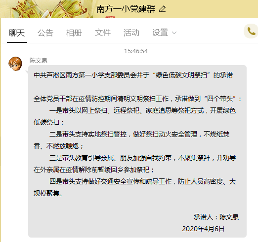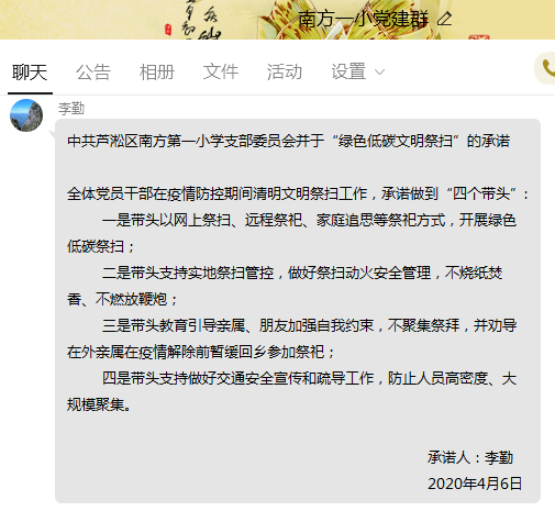 自选环节,南方一小党支部把开展绿色低碳文明祭扫作为4月份党支部主题党日活动重要内容,组织开展党员干部承诺活动,号召全体党员干部在疫情防控期间清明文明祭扫工作,承诺做到"四个带头":一是带头以网上祭扫、远程祭祀、家庭追思等祭祀方式,开展绿色低碳祭扫;二是带头支持实地祭扫管控,做好祭扫动火安全管理,不烧纸焚香、不燃放鞭炮;三是带头教育引导亲属、朋友加强自我约束,不聚集祭拜,并劝导在外亲属在疫情解除前暂缓回乡参加祭祀;四是带头支持做好交通安全宣传和疏导工作,防止人员高密度、大规模聚集。