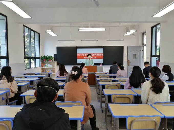 为落实上级教育部门关于中小学复学工作部署和相关文件精神,有效预防、及时控制和妥善处置学校可能出现的新冠肺炎突发事件,维护学校和社会稳定,2020年4月14日下午,湘江小学携手莲塘小学开展了“新冠肺炎”防疫工作培训。本次培训由校长邓英姿主持,全体教职工参加了此次培训。