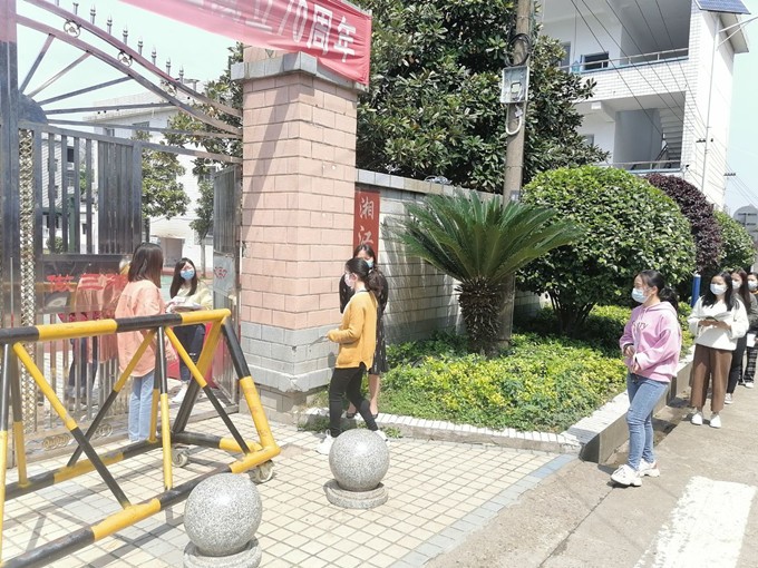 学校大门是校园疫情防控的第一道防线,把好校园第一道关卡至关重要。4月16日下午,全校教职工在赵岚主席的主持下进行了开学报道演练。演练流程:模拟学生排队等候进入校园(保持1米以上的安全距离)——检查学生健康码——学生依次走过测温区(体温异常的学生由专人带至隔离区并作进一步观察处置)——体温正常的同学上交《学生复学防控疫情承诺书》——有序进入校园。