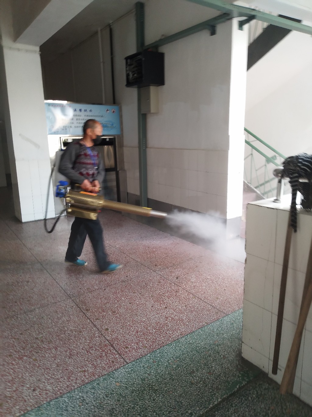从厕所到楼道,从操场到走廊,消毒人员肩扛消毒液箱,手提汽油动力喷雾机,长长的淡白色消毒液呈雾状洒落,不到一个小时,学校的公共空间消毒工作即已完成。据悉,本设备由1606班杨心月家长捐赠,假期中还有部分家长捐赠了消毒液等物资,热心家长的爱心举动也得到了师生和家长的一致好评。