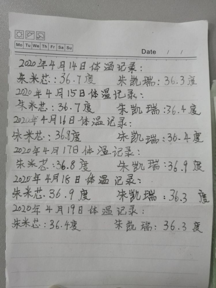 长垅小学的学生们为了个人健康及他人安全,在家长的配合下,自家进行体温测试。