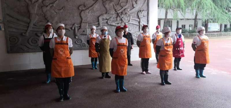4月20日,是贺家土小学四五六年级学生错峰上学的第一天。清早,食堂负责人再次组织全体员工进行培训,在前两次全员培训的基础上重点就体温检测、餐具用具的清洗消毒、食品留样、配餐送餐、废弃物的处理等做强调,通过培训真正做到人员管控从严检查,食品采购从严落实,操作流程从严要求。