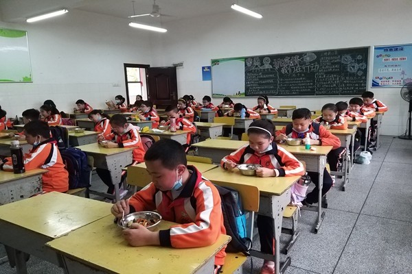 学生的用餐管理是校园疫情防控的一道重点防线。为了保持有效间距,教室内座位按照7列摆放,适当拉开距离。全校每个班安排1名配班老师协助班主任。班主任和配班老师提前对学生进行候餐、用餐培训和演练。建议学生自备免洗洗手液,强化学生餐前便后洗手的习惯。要求候餐时前后保持1米左右的距离安静有序等候,班内错时就餐;不得讲话,不得交头接耳和打闹。学校分年级安排行政人员负责检查评价。