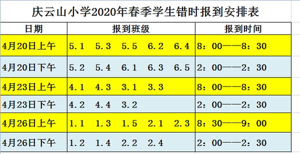错时报到,减少人员聚集。疫情防控期间,为了尽量减少人员聚集,学校教导处制定详细的“错时报到”安排表,学生分三天、六个批次错峰入校,完成开学报到的各项活动。