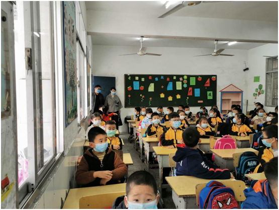 彭局长首先察看了校门口学生进校、测温、登记、消毒操作等流程,接着到教学楼巡视课堂学习、教室通风等情况。