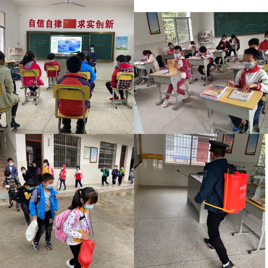 开学后每天早上学生分批次戴口罩到校门口,学校老师组织学生以间隔一米的距离排队主动测温与手部消毒。中午学生分班就餐。餐前学生之间间隔1米排队洗手,然后进教室等待分餐、间隔一米就餐。在疫情防控方面,我校坚持进行体温测试一天两次,即晨午检各1次并及时进行登记,每天放学学生错峰离校后进行全校消毒工作。