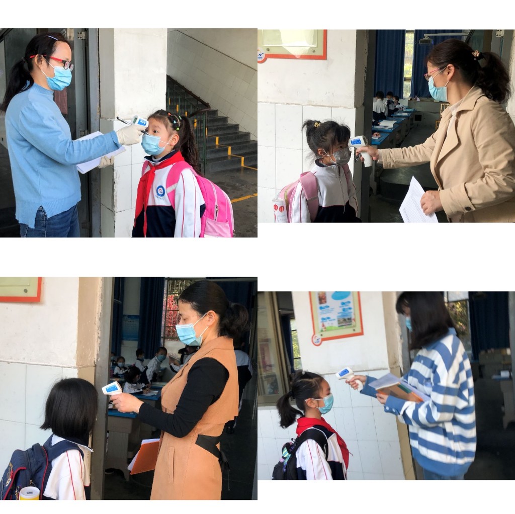 学校为了严把人员管控关,严格执行入校要求。同学们在家由家长监测第一次体温,入校前在校门口脚踩消毒垫进行消毒,通过红外测温仪,再由老师在学生手上喷洒酒精消毒,经由规定路线进入教室,班主任站在教室外依次为学生进行晨检、登记、询问。