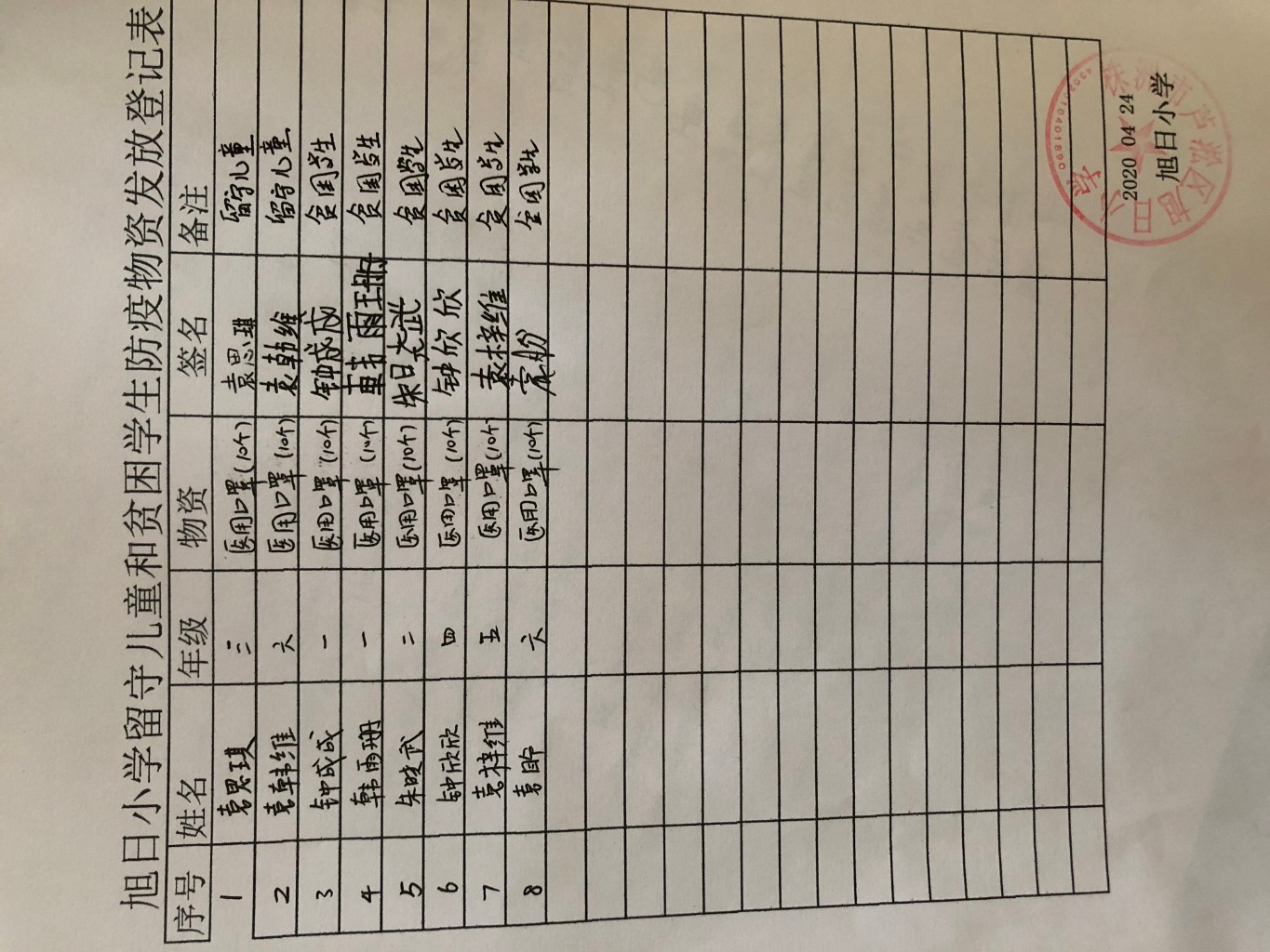 2020年4月24日,旭日小学开展"传递爱·温暖同行"关爱留守及贫困儿童防疫物资发放活动,为家庭困难的农村留守儿童、贫困儿童送温暖、献爱心。
