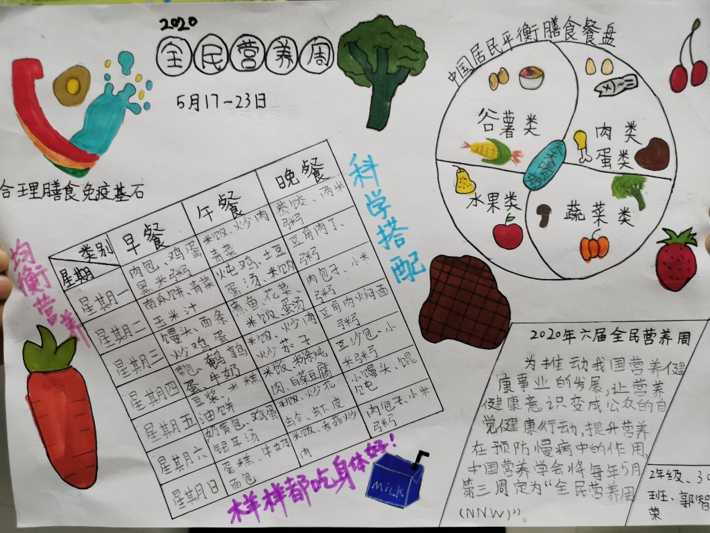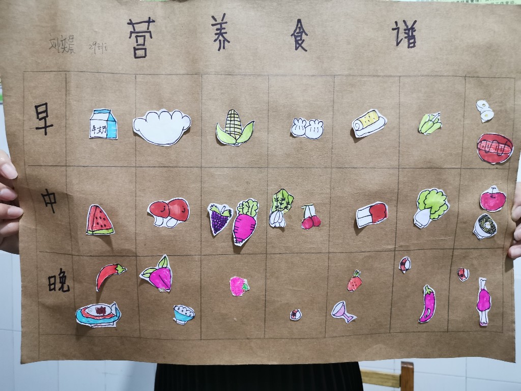 一、二年级学生在老师们的组织下,利用全民营养周工具包中的膳食宝塔、餐盘、算盘图形等工具,全员动手,设计搭配了有利于提高免疫力的一日三餐食谱。