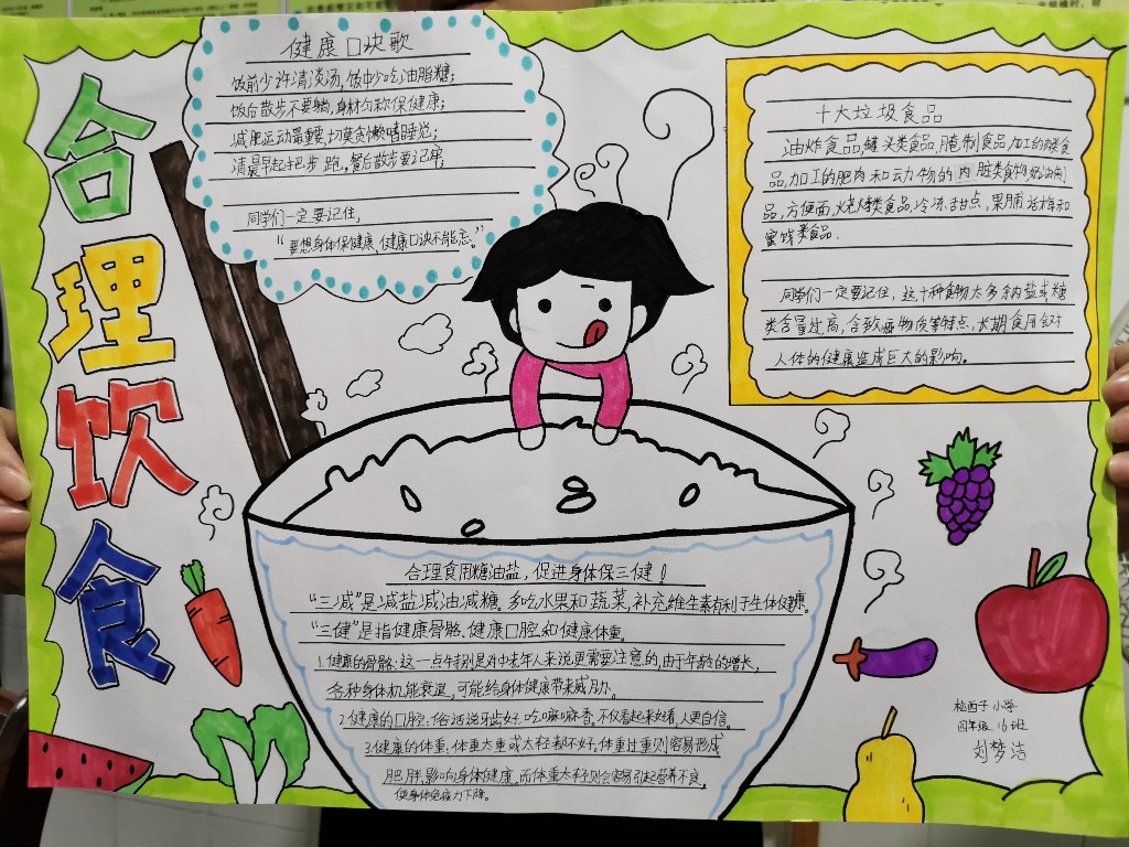 三、四年级学生在学习、搜集有关“营养”的知识、资料,独立制作主题为“合理膳食倡三减,良好习惯促三健”手抄报。
