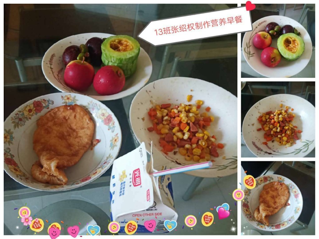 五年级学生通过对家人们身体情况的调查,结合营养膳食搭配提高免疫力的原则,为辛苦付出的家人设计并烧制一些美味健康的菜肴,这既锻炼了自己增长了知识,又能借助此次机会提高自己的劳动实践能力。