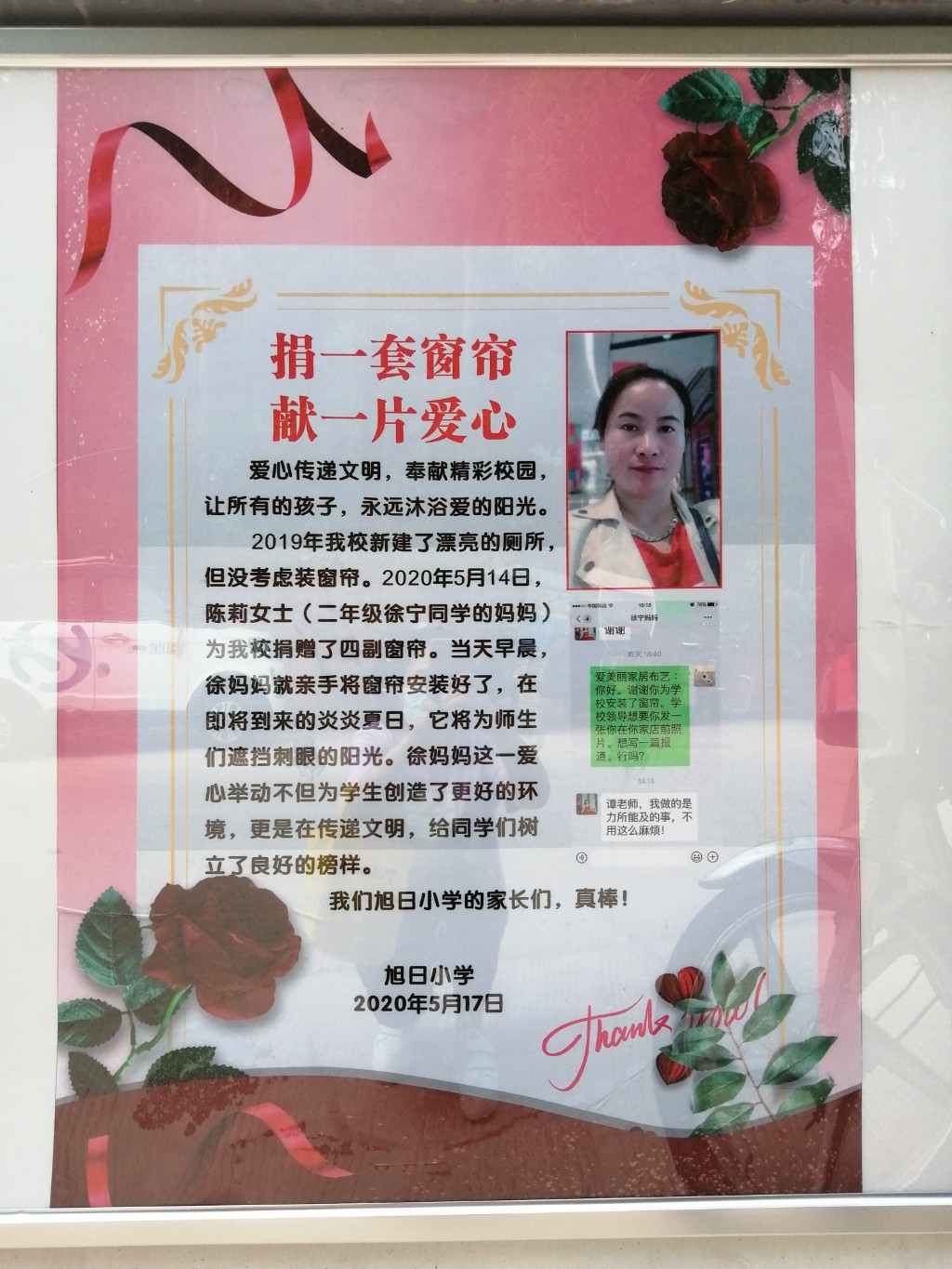 在政府部门的关心下,我校去年下学期新建了漂亮的厕所,但没考虑装窗帘。2020年5月14日,陈莉女士(二年级徐宁的妈妈)为我校捐赠了四副窗帘。当天早晨,徐妈妈就亲手将窗帘安装好了,在即将到来的炎炎夏日,它将为师生们遮挡刺眼的阳光。徐妈妈这一爱心举动不但为学生创造了更好的环境,更是在传递文明,给同学们树立了良好的榜样。