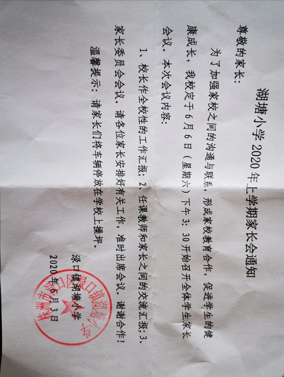 家长会前三天,学校向每一位家长发放了《湖塘小学2020年上学期家长会通知》,通知明确了家长会的时间、内容以及注意事项。