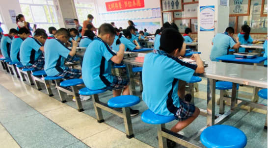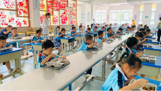 据校长唐素君介绍,“无声就餐”行动从上学期开始实施,本是为了培养孩子们的“就餐礼仪”,落实“食不言”的古训。没想到今年赶上疫情,做了一些改进,将“对向”就餐改成“同向”就餐,单人单座改成隔位就座,错时分批次就餐。在开学前,学校就将无声就餐的步骤拍成示范视频,方便同学们学习。开学后反复训练,分散错峰,减少交流,规范就餐行为,最终实现提升学生生活自理能力,提高校园文明度。