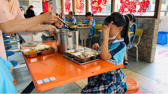 12:00整随着第二批就餐的学生进入食堂,整个食堂仍没有一丝的说话声,依旧保持着安静,仿佛按下了“静音键”。孩子们需要添菜添饭,如何能够做到不交流呢?原来学生们如需要加菜添饭,会通过眼神和手势进行交流。(手势“1”表示需添菜,手势“2”表示需添汤,手势“3”表示需添饭。)
