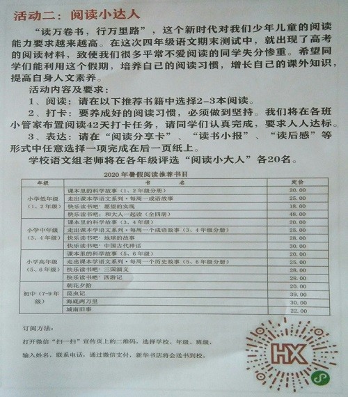 暑假之初,学校教导处、教科室与德育处携手共同制定了暑假学生课外阅读方案,号召全校师生积极参与到阅读的队伍中来。在活动方案中,首先依据学生的年龄特点分年级段向学生推荐了阅读书目,低年级段以科学故事和成语故事为主,中年级段除了科学故事和成语故事还增加了地球的故事和中国古代神话,高年级段引导学生慢慢走进中国古典文学名著《三国演义》《西游记》等。除此之外,活动方案中还明确提出了阅读的一些要求,如坚持42天的阅读打卡并完成"读书小报"或"读后感"等。让学生的暑假课外阅读有了明确的方向和方法。