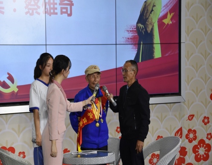 株洲市攸县人,现年99岁。1937年15岁的他参军成为黄埔军校第十六期学员,原国民党第9战区第29集团军162师上尉防毒组员。他曾是中国少年,现已是百年老兵。虽已皱纹丛生,腰背弯曲,却依然可见他敬军礼时那挺立的身姿。在采访中,当问到有没有后悔时,蔡雄奇爷爷坚定的说:我们青年一代不去当兵谁去当兵?我们不去打仗谁去打仗?只要有决心,根本就不会后悔,也决不后退,面对日本的侵略,我们只会勇往直前,跟他们干到底!