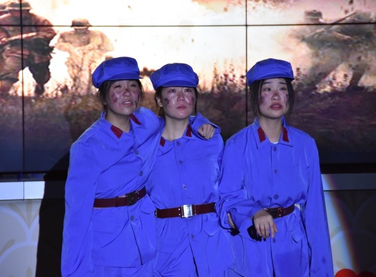 渌口区第五中学高二年级播音主持专业的学生朗诵表演了《致敬——以青春的名义!》最后在全体合唱《歌唱祖国》的歌声中结束了本场活动。