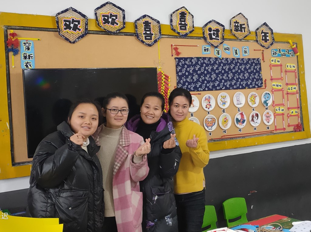 来到朱亭镇中心幼儿园后,根据该园的现场情况,副园长黄伟临时将教师分为小班组与大班组进行环境布置。小班组环创由副园长黄伟带队,成员:园长姜瑜、杨涛老师、魏彬老师。大班组环创由副园长涂敏带队,成员:谢倩玉老师、陈心怡老师。老师们围绕"欢欢喜喜过新年"主题展开了一系列讨论与分工,根据主题墙规划出每个板块内容,分工明确后,经过老师们探讨与合作,运用剪纸、扇子、灯笼、鞭炮等多种形式,使整块墙壁有声有色,让人一看到就想到了马上要过新年啦!功夫不负有心人,在老师们的团结合作、精心创作下, 魔术般地将教室的主题墙焕然一新!