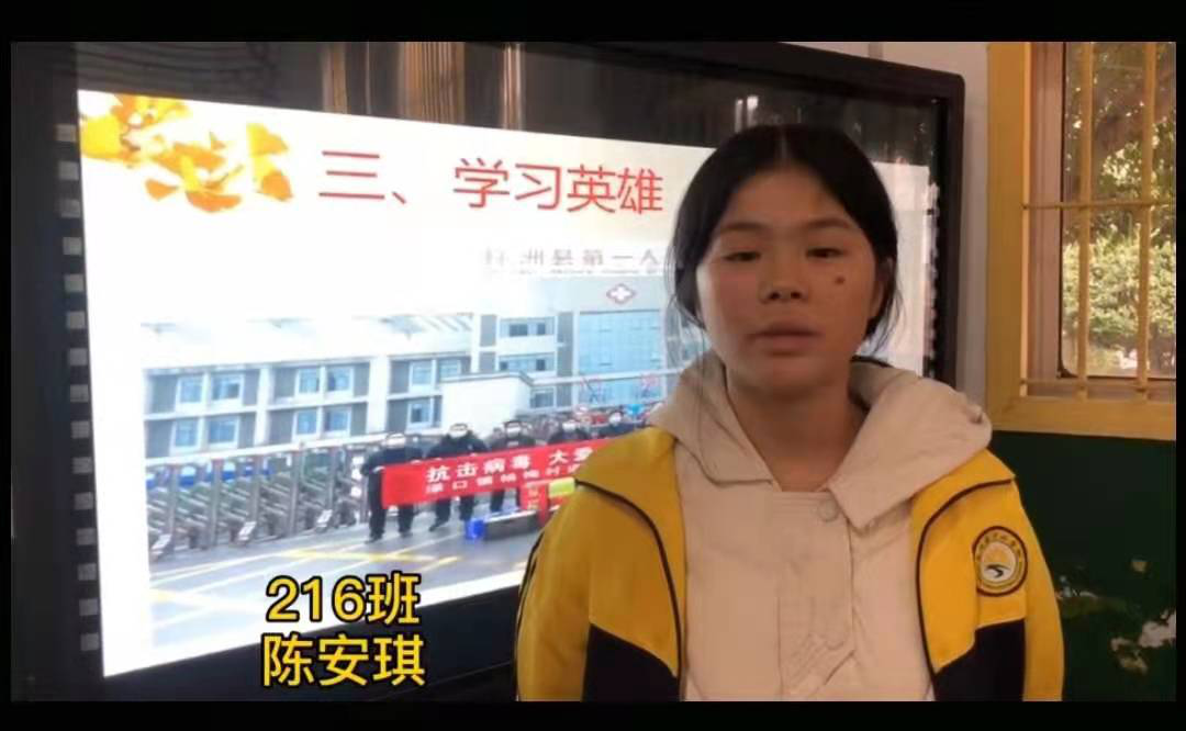 姚老师以生动朴实的语言,回眸党的光辉历程,回顾自己在部队的切身经历,展望美好前景。教育同学要倍加珍惜来之不易的幸福生活,提高民族自尊心和自豪感,进一步发扬以热爱祖国、贡献力量为光荣的良好风尚。同学们神情凝重,端坐在安静的教室里,聆听老师的分享,品味英雄们壮丽的人生,感受浓浓的爱国主义精神。