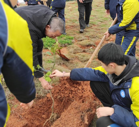 龙头铺中学开展了“青春心向党,植绿美家园”为主题的春季植树活动。学校德育主任首先对活动进行了安全教育,随后分班分小组领取树苗、劳动工具来到校园“花园一角”,在植树经验丰富的家长志愿者指导帮助下,挖坑、放树、护苗、填土、浇水、挂牌……每个同学都在团结协作中积极动手,为美化校园贡献自己的一份力量。