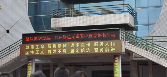 为进一步加强在校学生对毒品危害的认识,增强自我保护意识,构建无毒校园,我校于3月15日上午9:30,在操场进行了禁毒宣誓签名活动。
