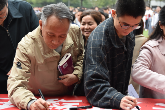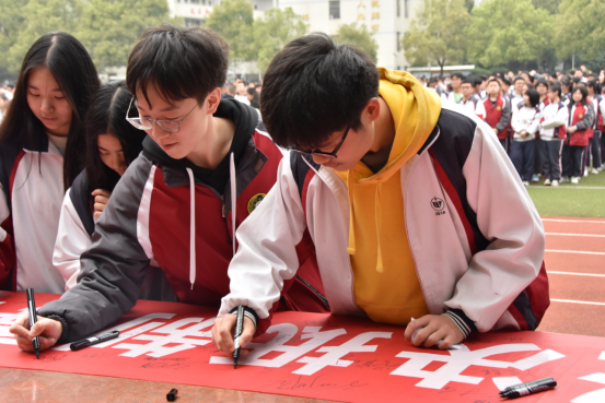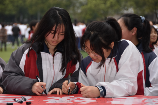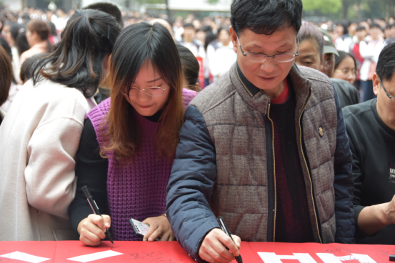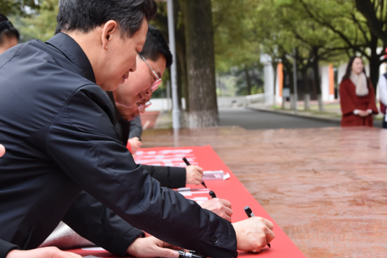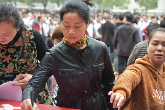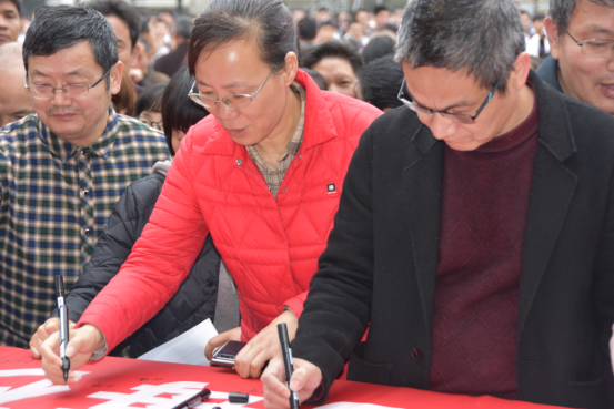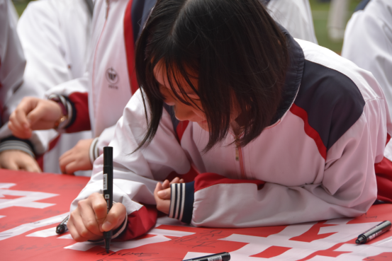 现场领导与师生代表在禁毒横幅上郑重地签下自己的名字,表明自己珍爱生命,抵制毒品的决心。学生们紧密地围绕着长幅禁毒标语、毒品危害标识等签名,你一笔我一笔,共同“禁毒”。