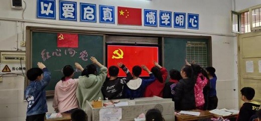 班会课上,各班主持人们有模有样,利用课件带领同学们重温党史,帮助孩子们了解党旗、党徽的含义,呼吁大家要热爱中国共产党,始终跟党走,从小树立远大理想,努力成为有担当民族复兴大任的时代新人!活动中,同学们通过讲故事、唱红歌、朗诵诗歌、知识问答等形式,知党史、抒党情、颂党恩、听党话、跟党走。党的风雨历程让党的光辉形象在少先队员们的心里更加鲜明,更加深刻。同学们纷纷用自己的方式向党旗敬礼,表达着自己的崇敬之情。各班级还通过集体宣誓形式加强对党的认识,坚定永远跟党走的信念。"准备着,为共产主义事业而奋斗!""时刻准备着!"的誓言声,铿锵有力,响彻教室。